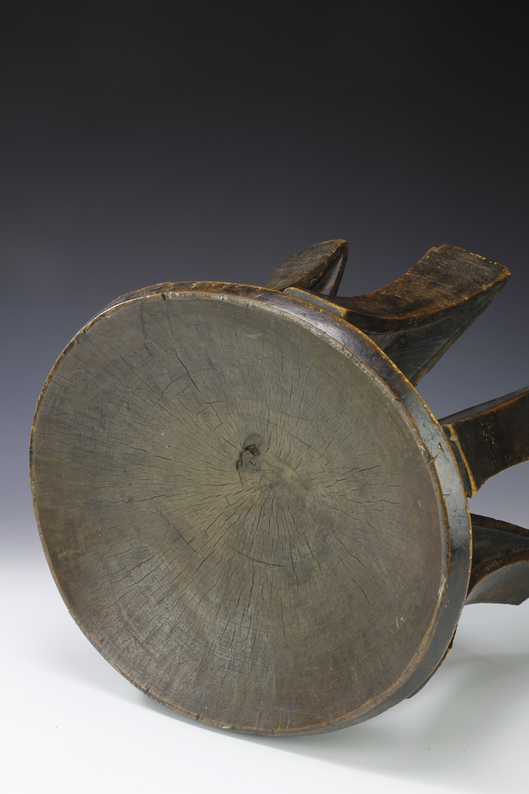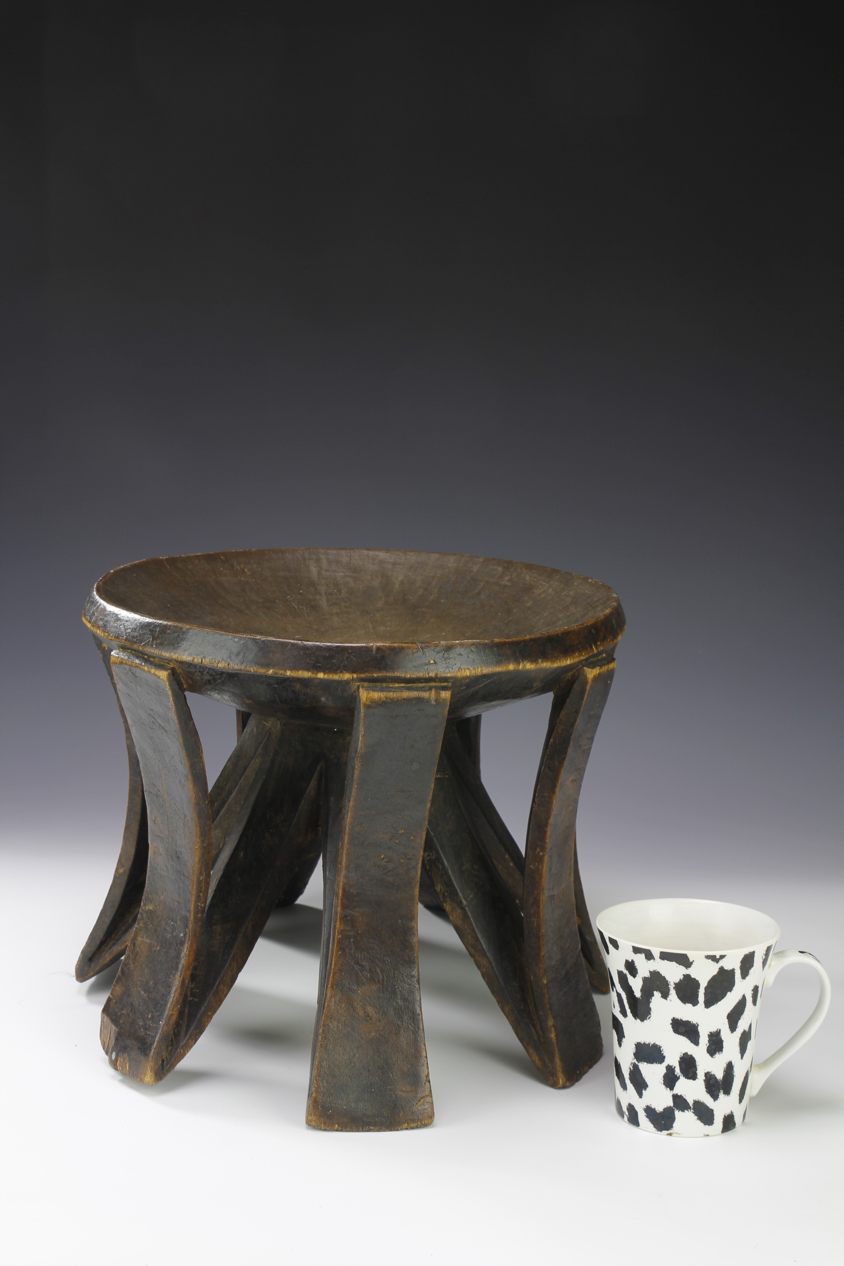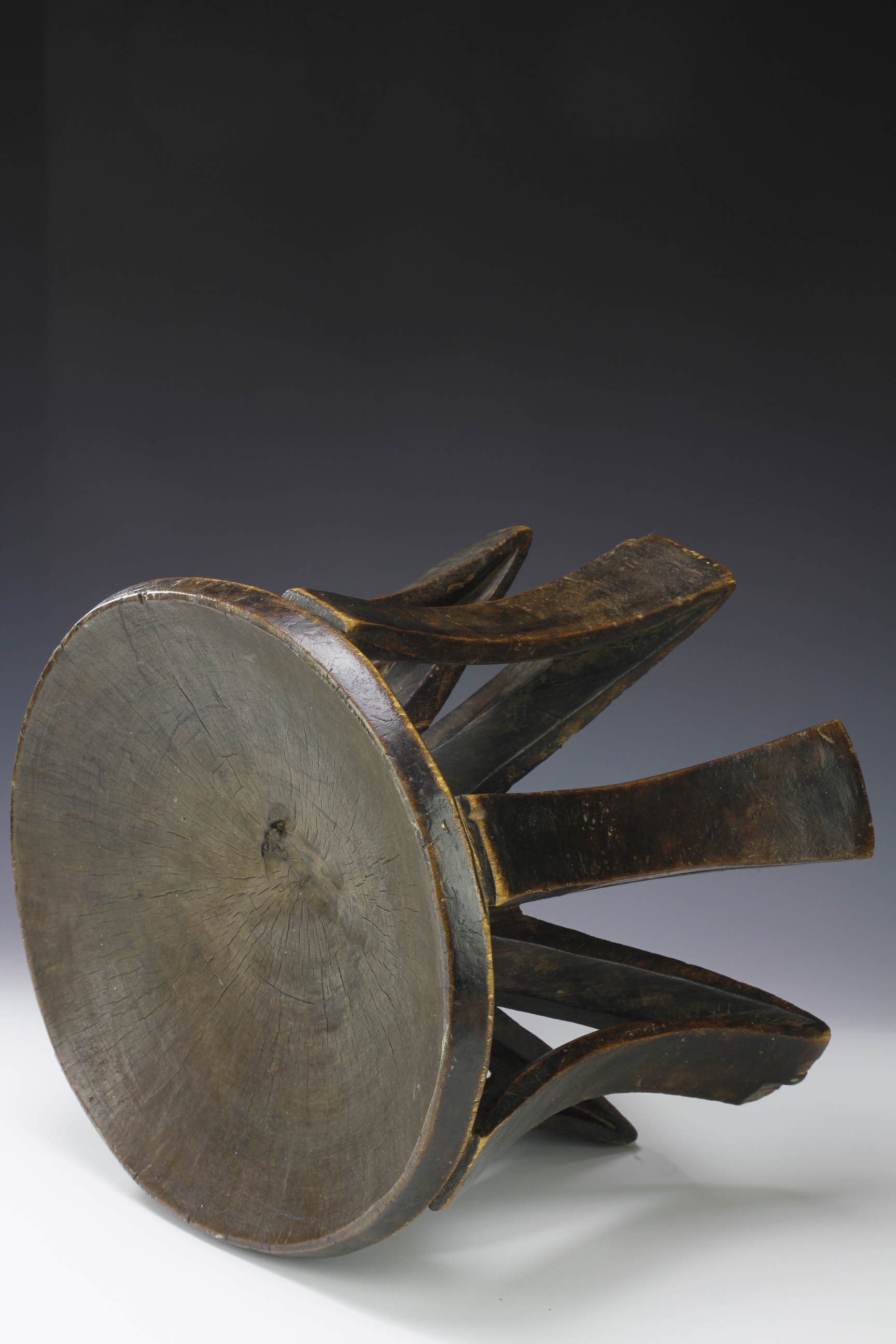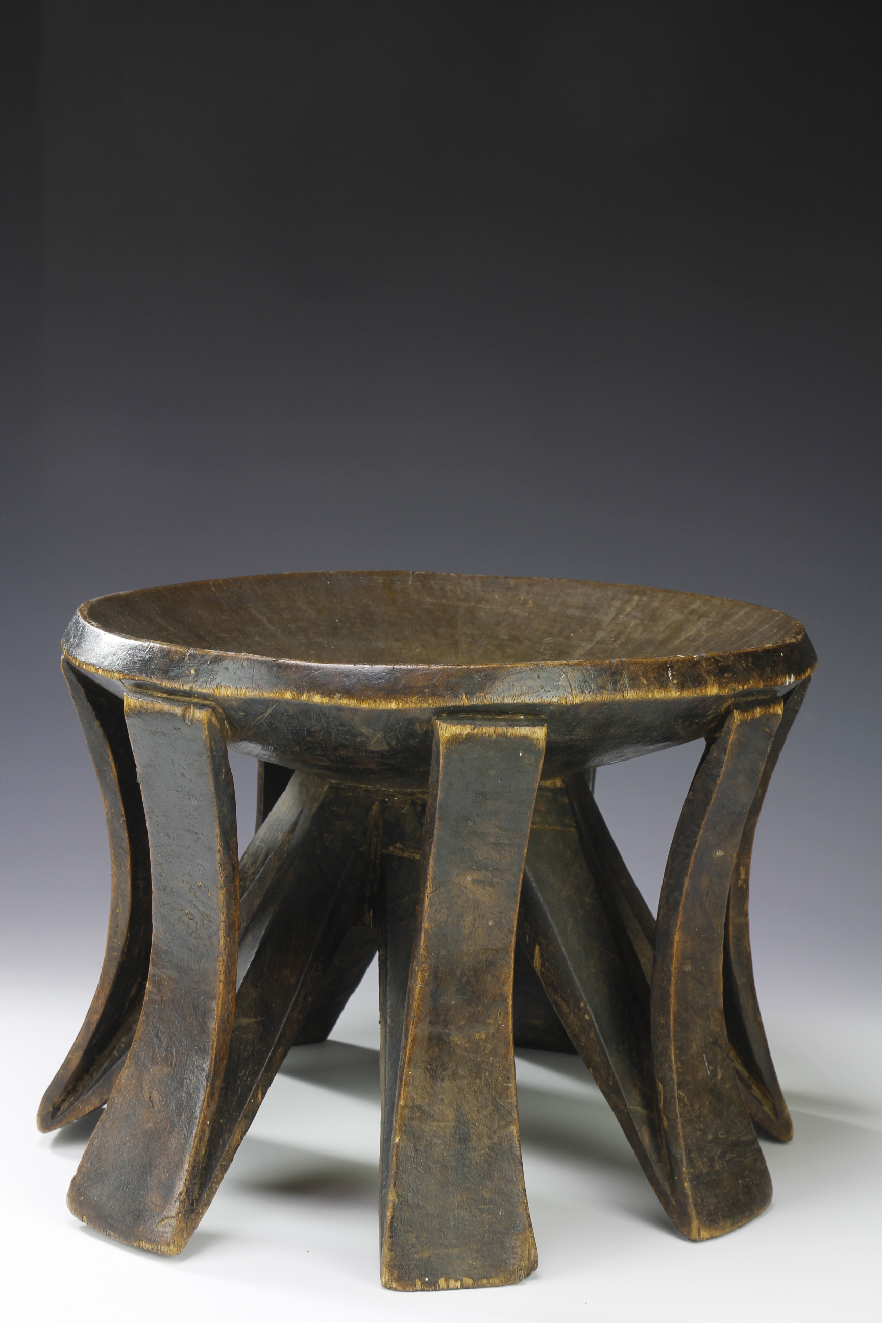 Carved from one piece, the stool has a beautiful and rare form comprising of seven curved and slightly flarred supports each with a supporting structure starting from the base of each leg and meeting at the center of the underside of the stool. The surface patina is deep and worn.