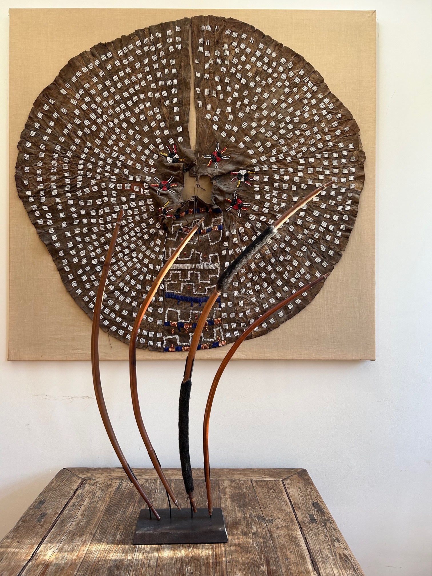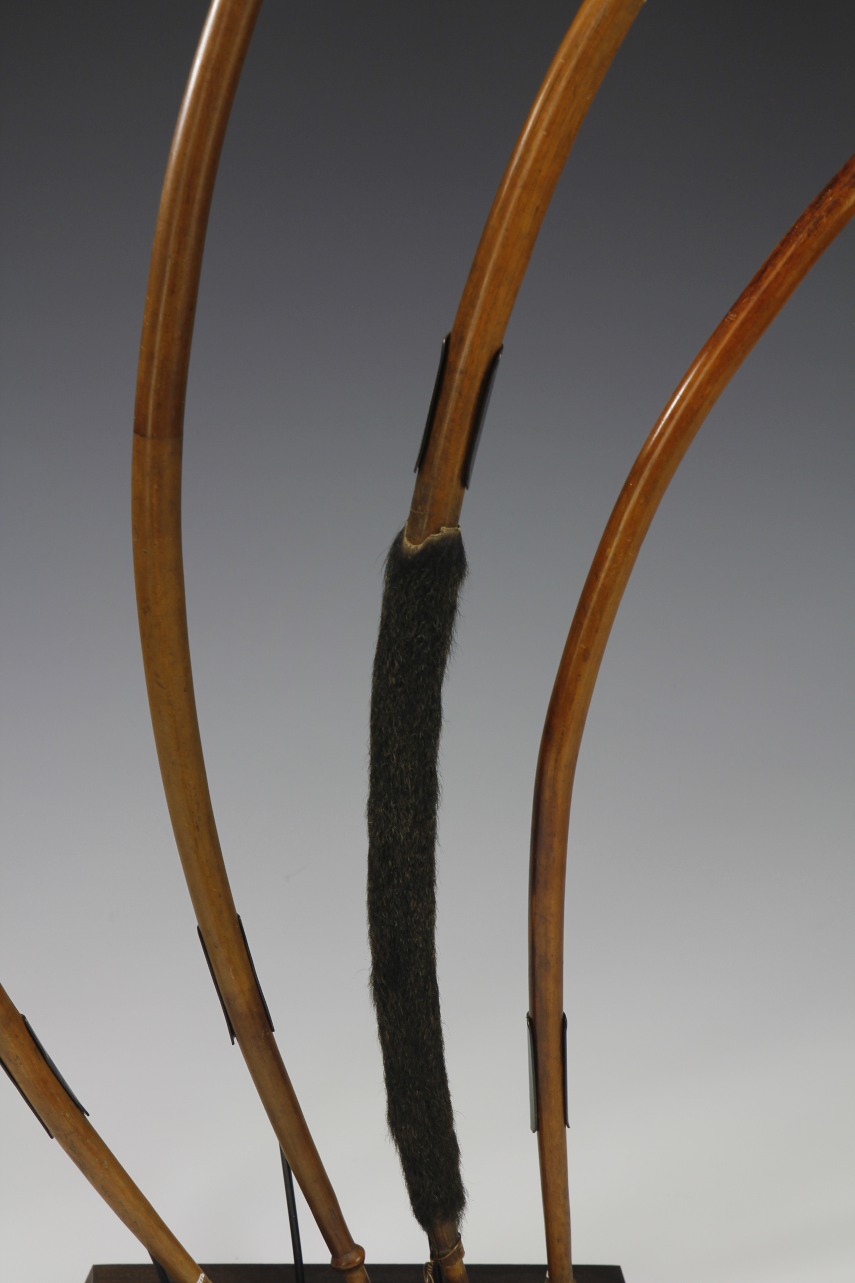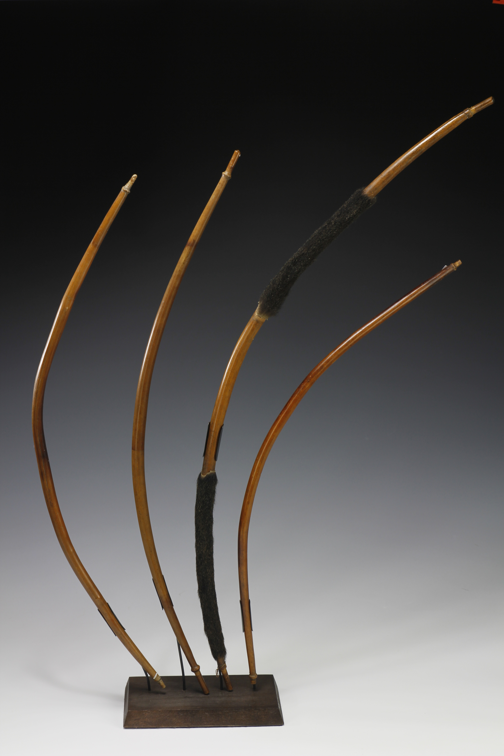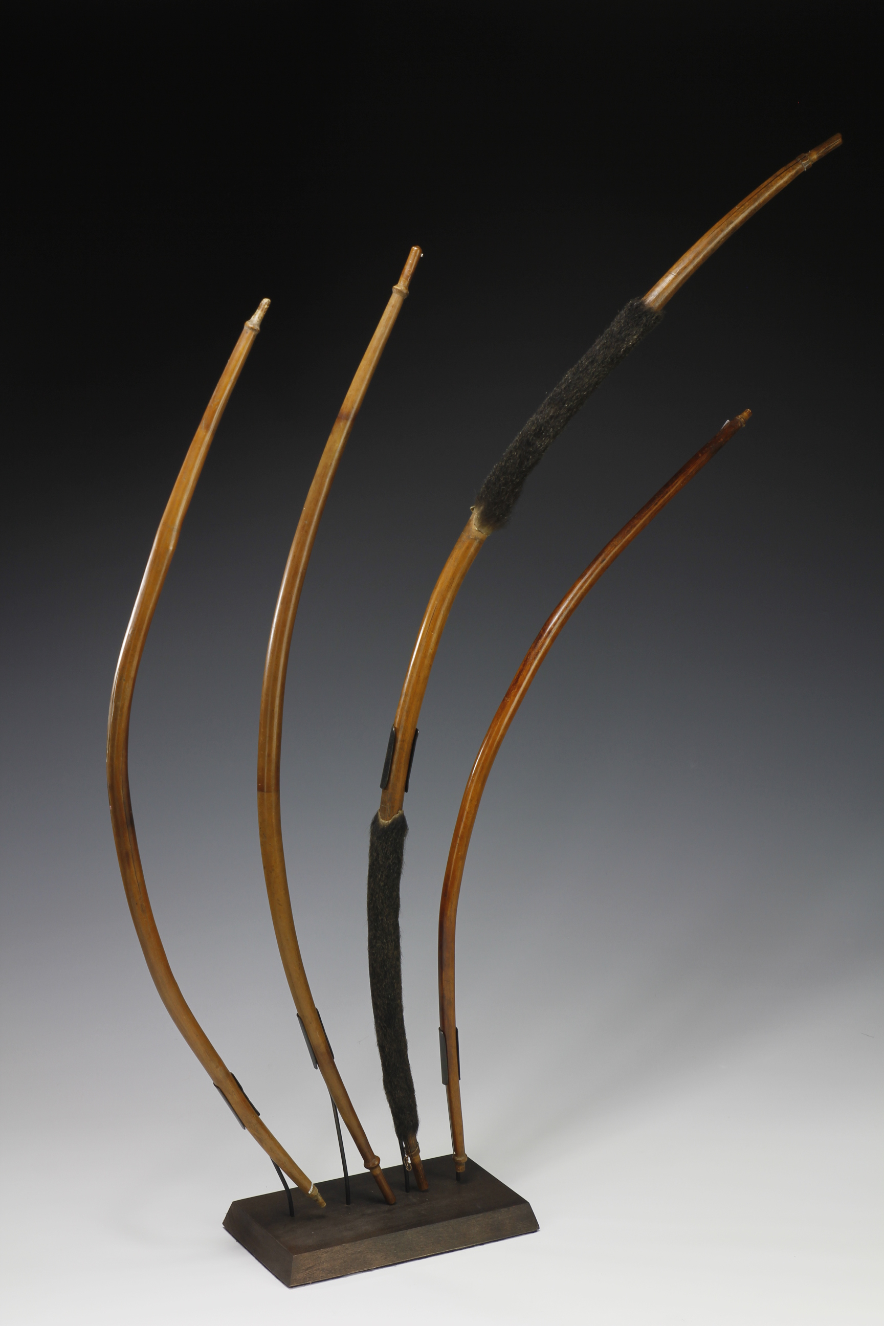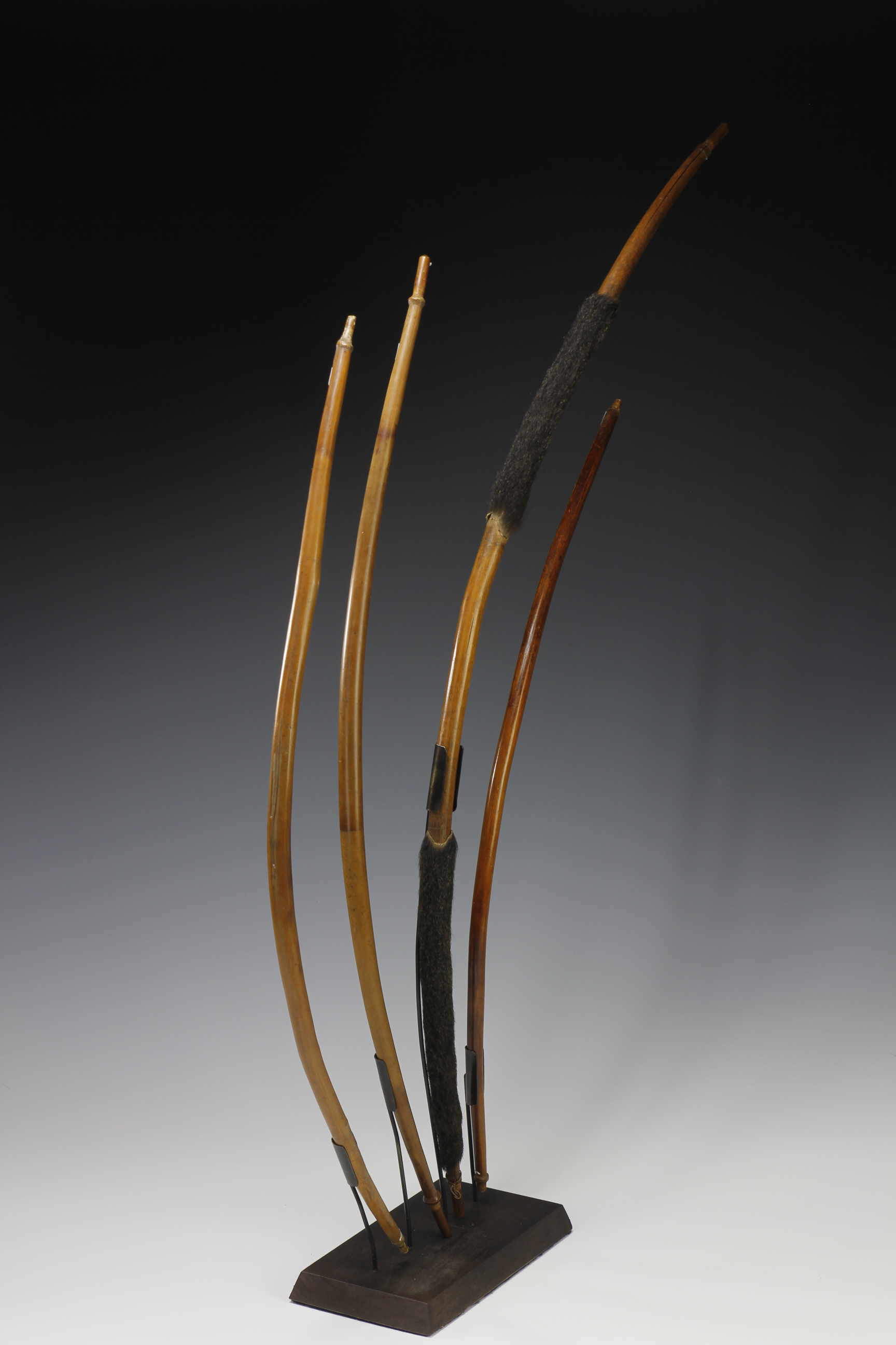 A collection of beautiful rare hunting bows, all with a deep worn patina's,one has been partly covered with strips monkey fur.Because of their relitive small size, It is likely these were used by Pygmie's in North-Eastern to hunt forest monkeys.