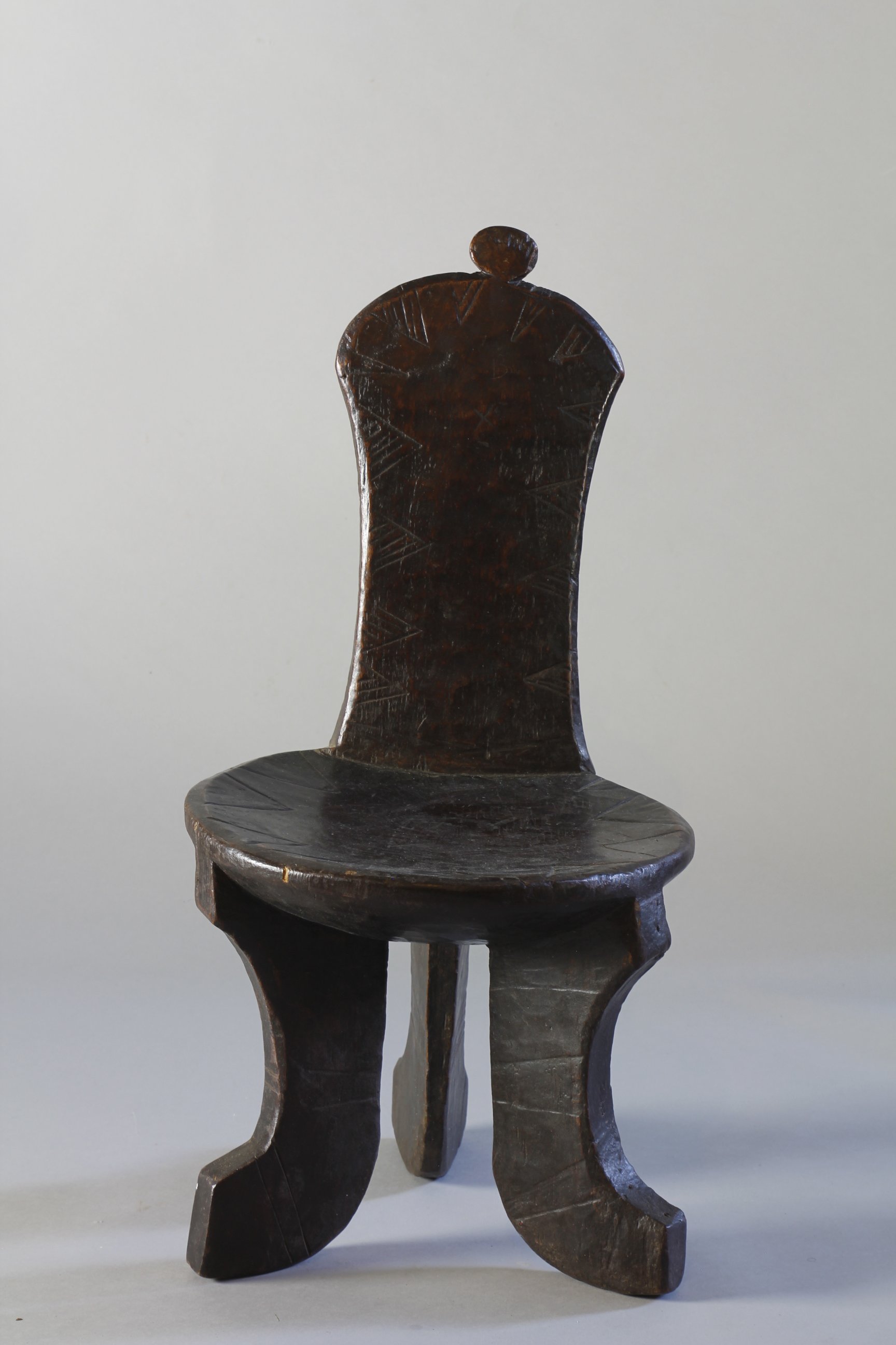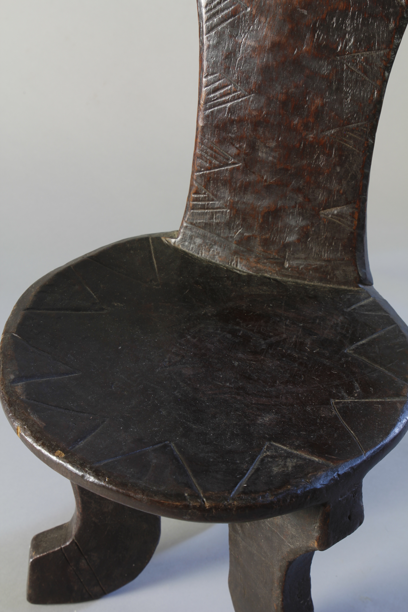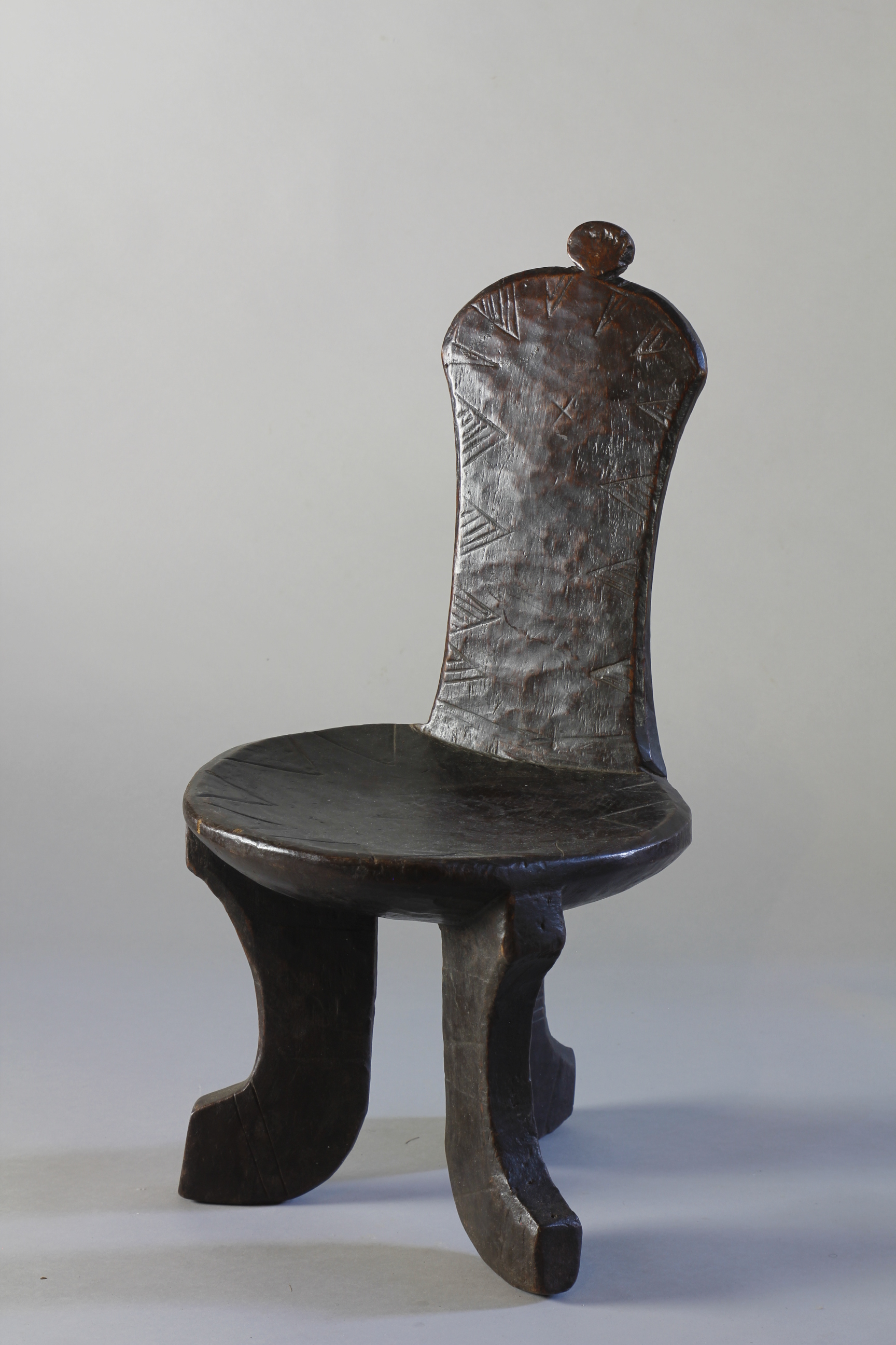 This small chair from the Jinka region of Ethiopia features three beautifully curved legs supporting a circular seat - and at its centre, an elongated, upright back support culminating in a circular decorative detail. Throughout, the backrest exhibits a lovely glossy, rich surface patina, and at the front, has been finely engraved with an edging of triangular-shaped motifs.