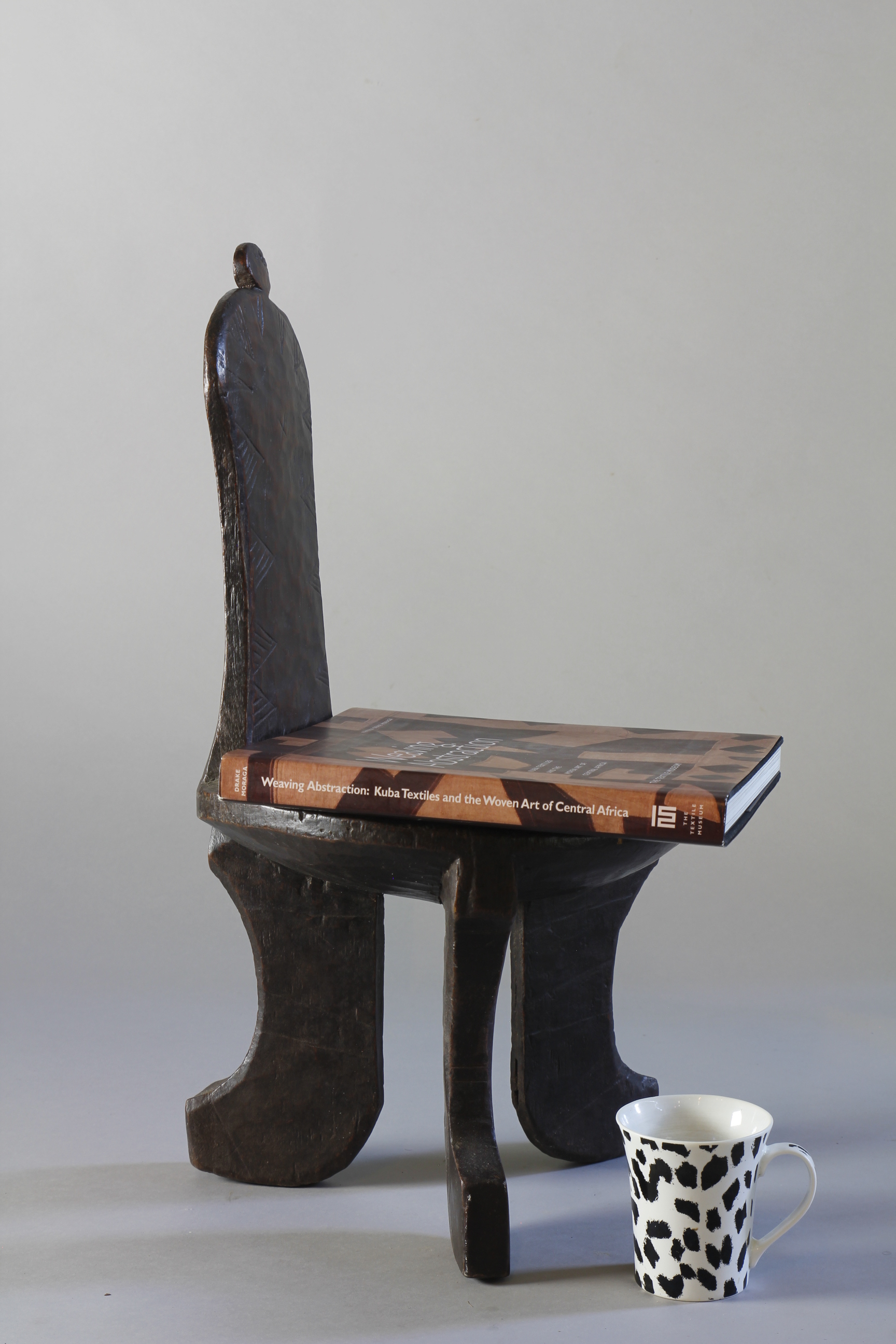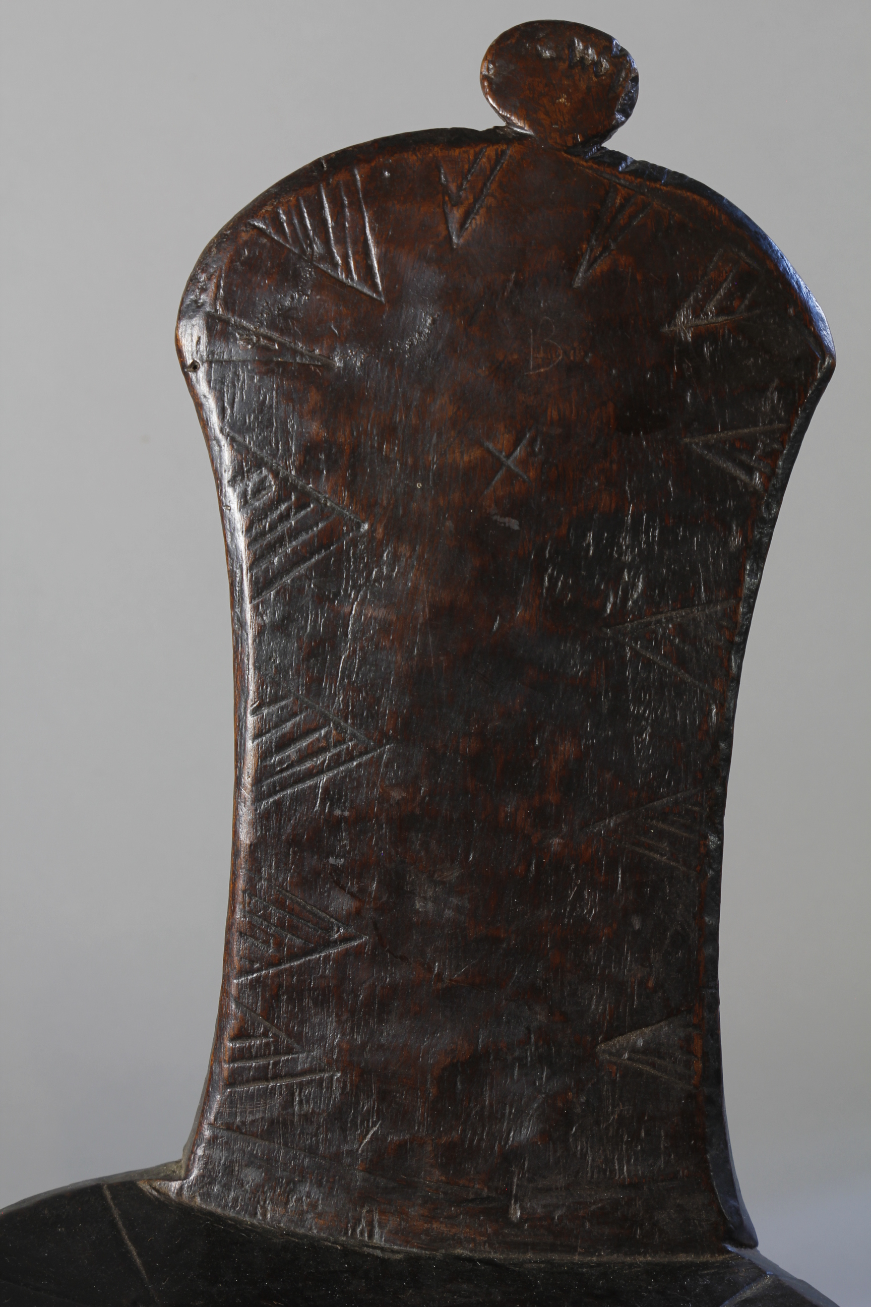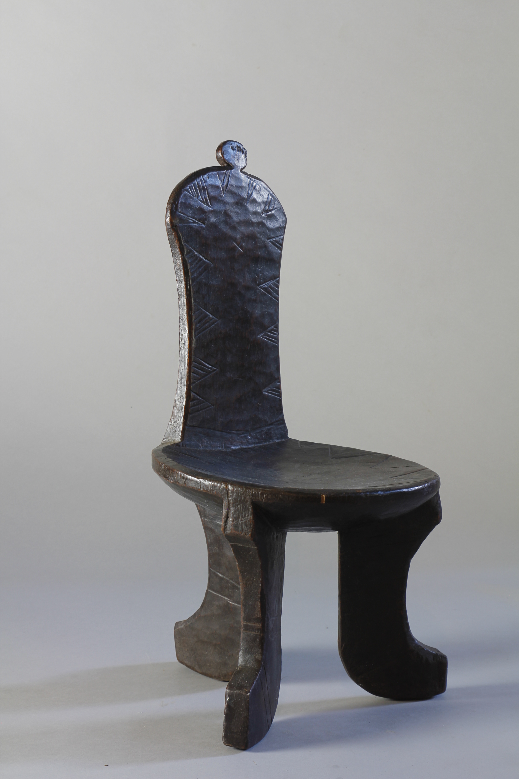 This small chair from the Jinka region of Ethiopia features three beautifully curved legs supporting a circular seat - and at its centre, an elongated, upright back support culminating in a circular decorative detail. Throughout, the backrest exhibits a lovely glossy, rich surface patina, and at the front, has been finely engraved with an edging of triangular-shaped motifs.