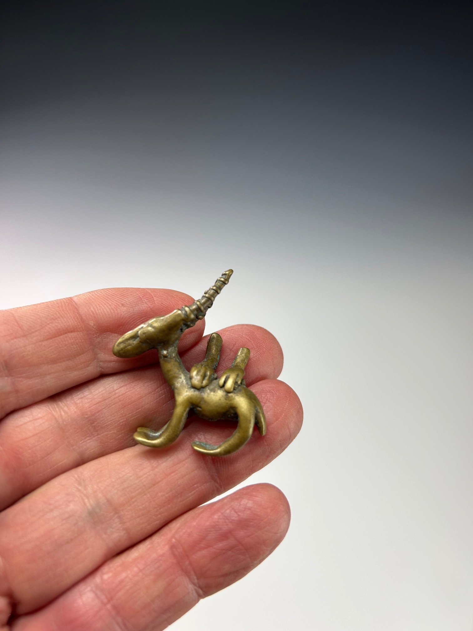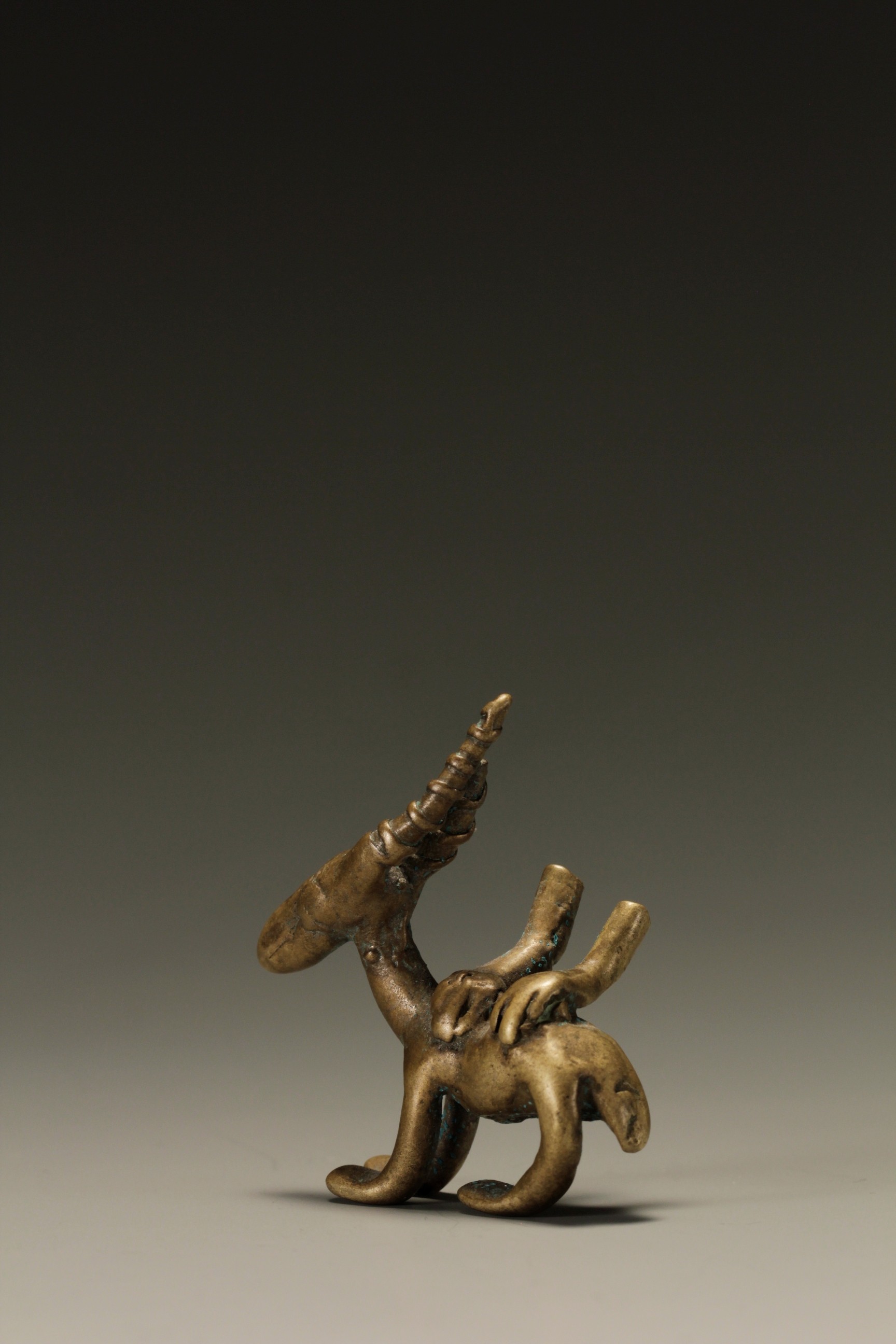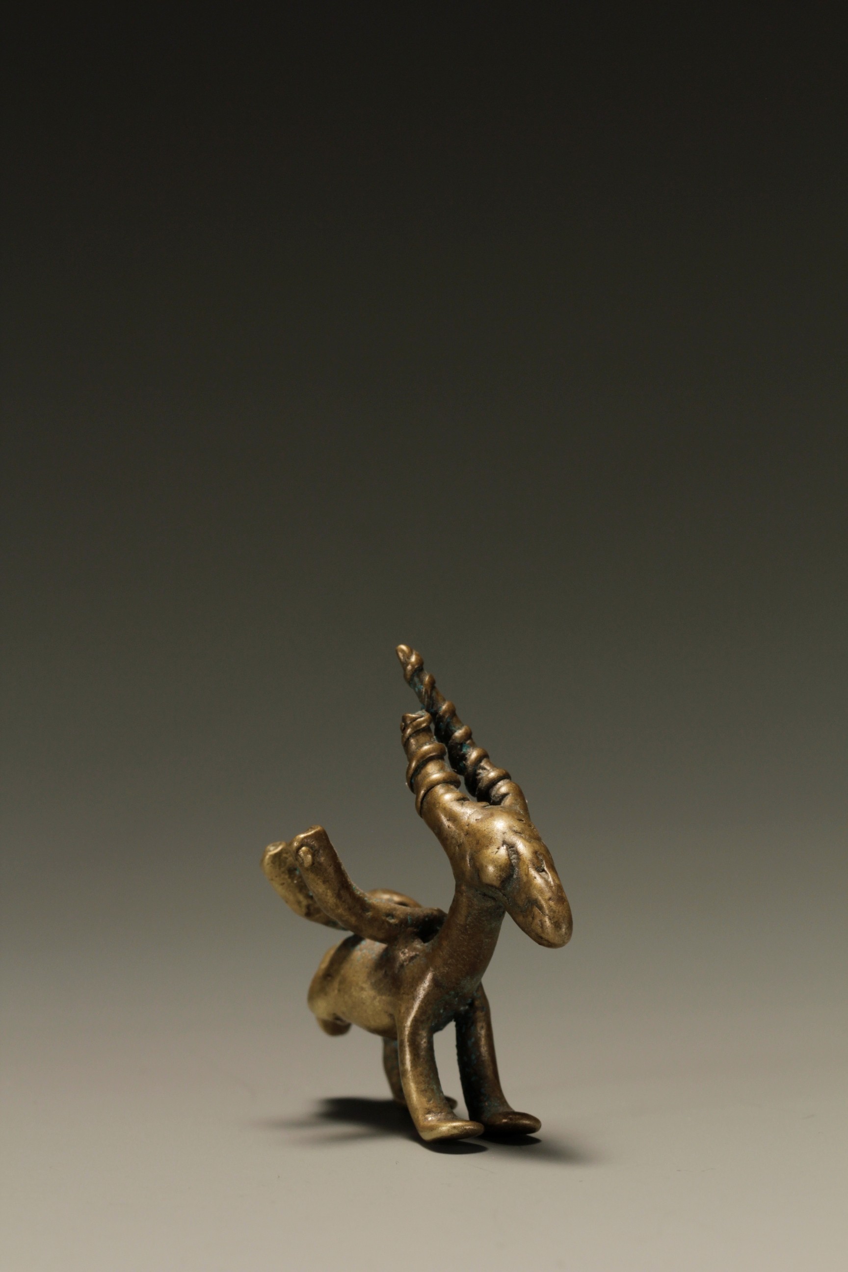 The weight is very unusual showing a antelope or gazelle with raised horns, standing with two human hands resting on its back. One of the legs to the gazelle (the back right leg) is missing. Its very rare to find a weight of this type, no other published examples can be found. Weather the weight is related to some Akan proverb is not known. The surface is very smooth and worn,the weight would date to the 19th Century.