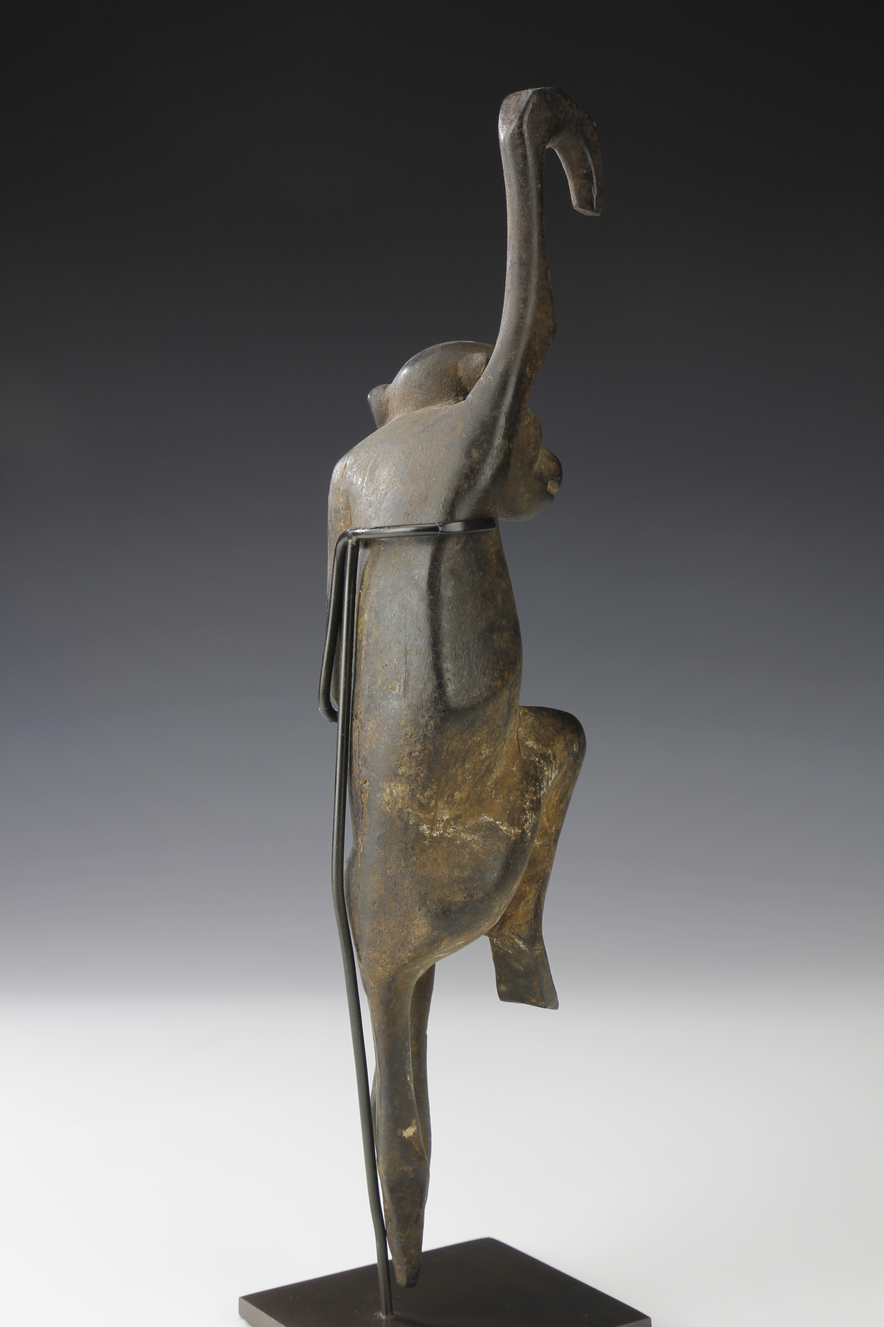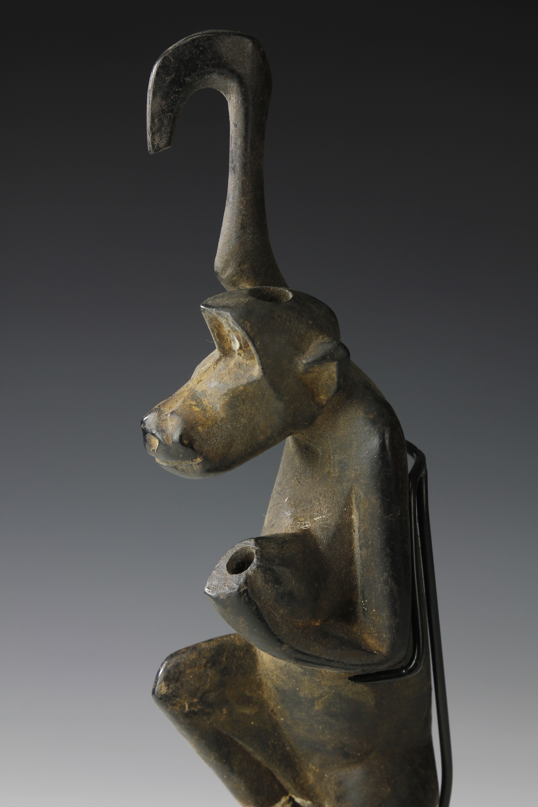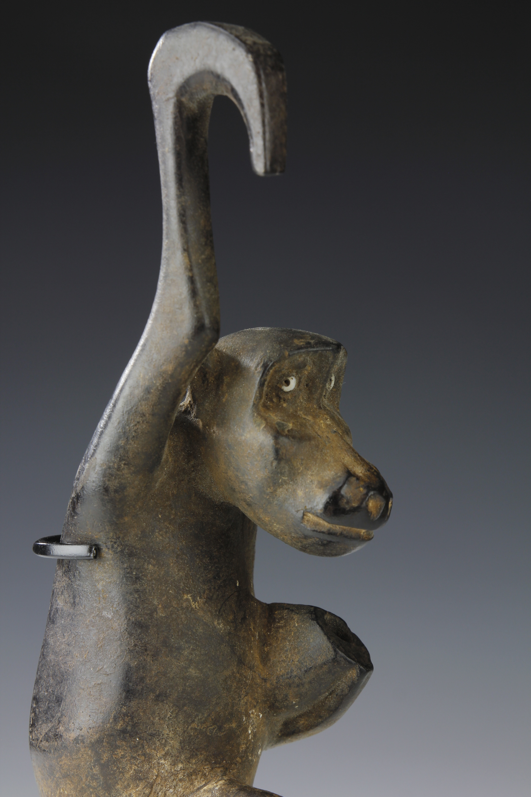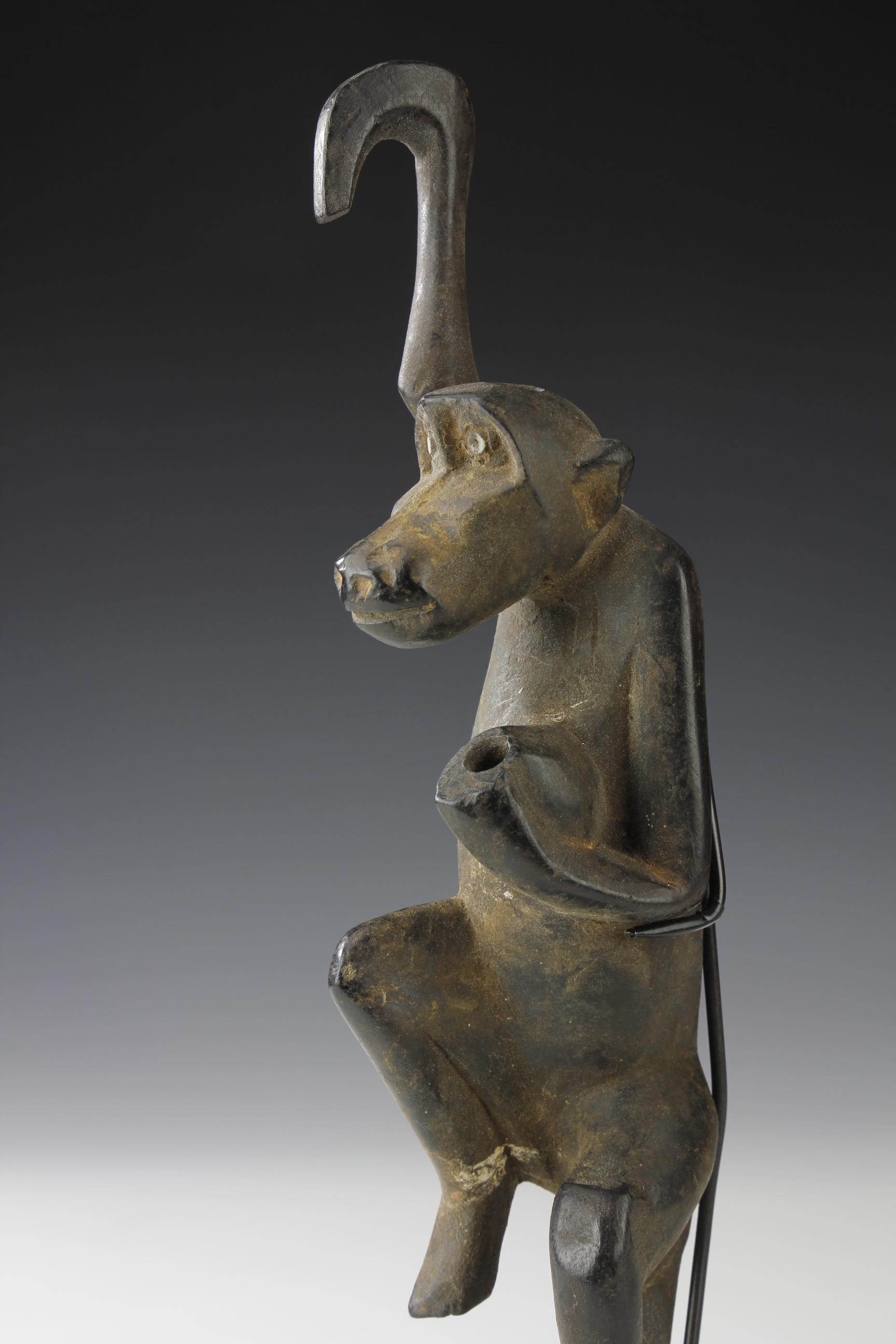 A Zigua fetish figure depicting a monkey holding a fruit (probably a coconut) tightly to its chest. There is a fetish cavity at the top of the monkey's head and at the entrance of the coconut. The monkey’s hock-shaped raised hand, with a darkened shiny patina, is likely where the piece was traditionally held during rituals. Its long tail adjoins its lower bent leg.